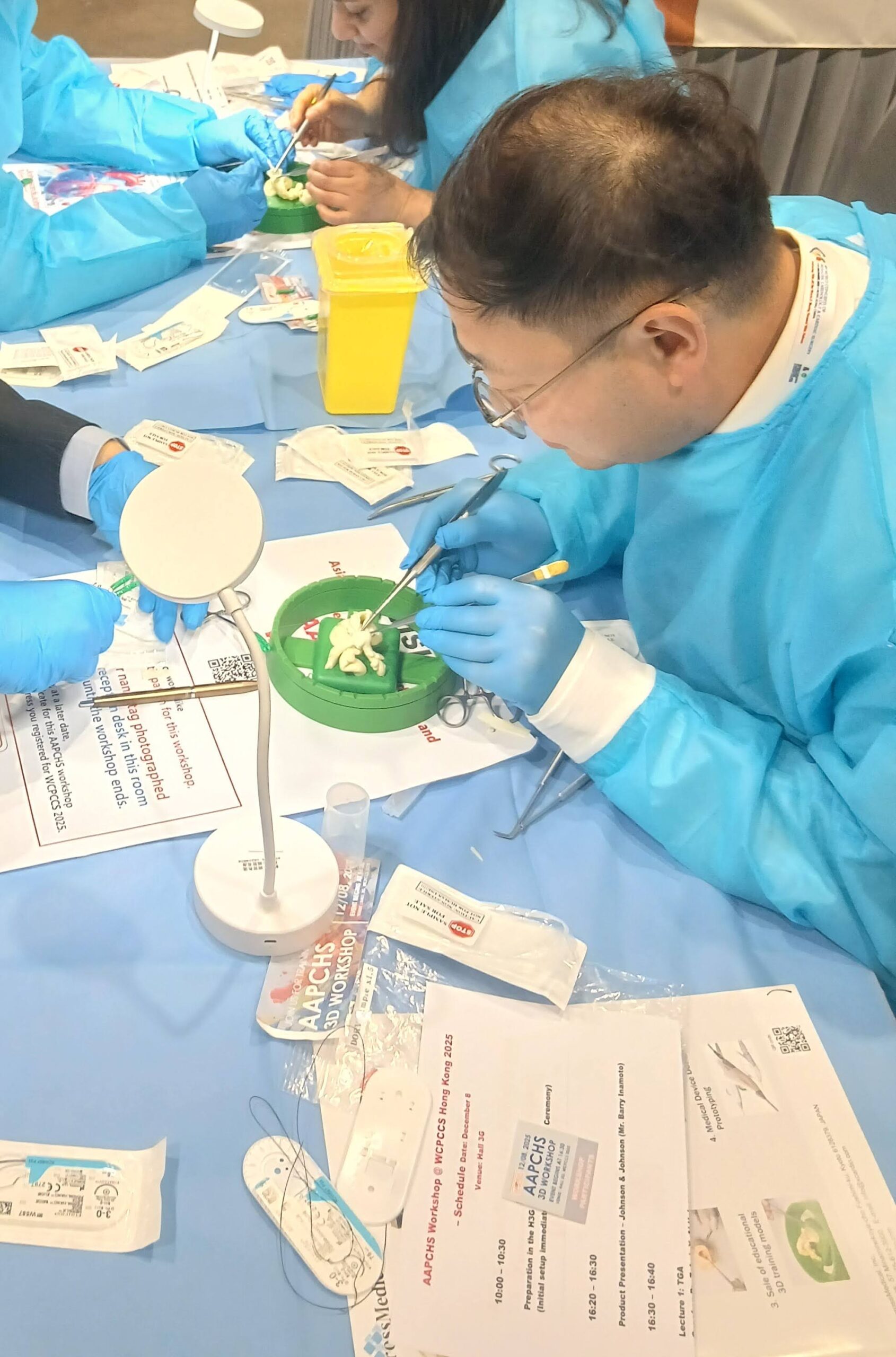 アジア各国から参加された約20名のドクターに、糸針を用いた実践的な手技トレーニングをご体験いただきました。
